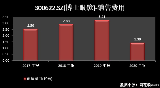 从销售收入比例来看,博士眼镜从2015年至2020年H1直营门店的销售收入占据99.04%、97.97%、97.89%、93.17%、88.37%和81.90%,而2019年电子商务销售收入占比仅为7.47%。如此看来,公司的营业收入主要依赖于门店渠道。而在直营销售模式下,销售费用过高问题难以解决。
