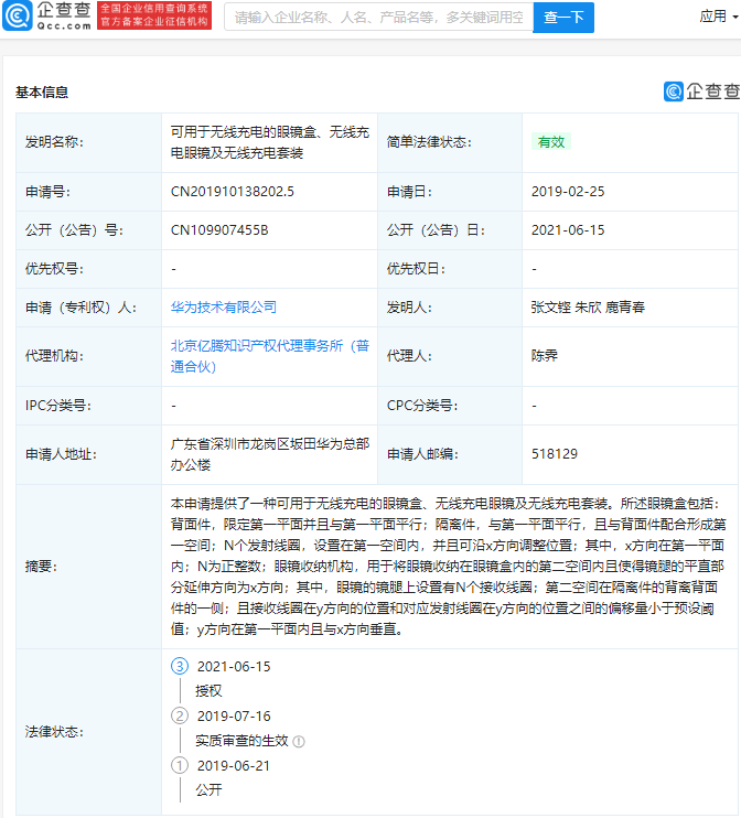 新京报贝壳财经讯 企查查App显示,6月15日,华为技术有限公司获得“可用于无线充电的眼镜盒、无线充电眼镜及无线充电套装”专利授权,公开号为CN109907455B。